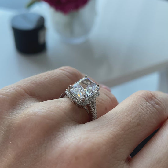 Piedra principal tono cristal con brillo particular por el corte Radiante en forma rectangular, sobre una montura de doble banda, rodeada de pequeñas piedras corte clásico que hace lucir aun más el anillo completo.