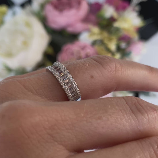 Media churumbela con 3 hileras de piedras, al centro pequeños baguettes, las orillas delineadas con pequeñas piedras de corte clásico.