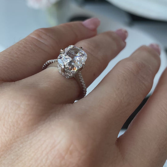 Piedra principal en tono cristal en corte cushion, la montura hace lucir la piedra principal divinamente con su halo de pequeñas piedras corte clásico sobre una banda delgada y solida.