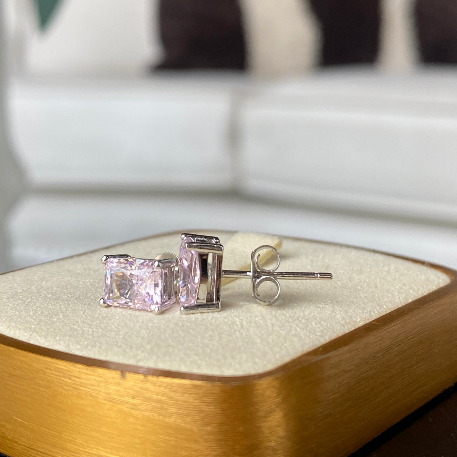 Arete con piedra tono rosa suave de 5x7mm en corte radiant montado sobre plata esterlina de alta calidad.